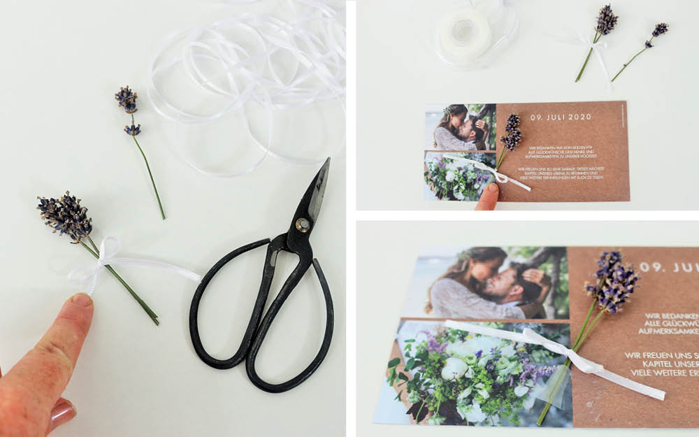 Greenery in die Deko einzubeziehen, ist nach wie vor ein beliebter Trend. Dazu können die Elemente aus dem Brautstrauß und der Hochzeitsdeko aufgegriffen und für die Karten verwendet werden. Die getrockneten Blumen können zur Zierde auch ohne die Dankeskarte noch lange zum Beispiel am Kühlschrank der Gäste hängen und somit erhalten bleiben. Möchtet ihr euer Kuvert mit Konfetti versehen, so könnt ihr dazu ebenfalls die Blumen verwenden. Besonders gut eignet ist dafür ein transparenter Briefumschlag.