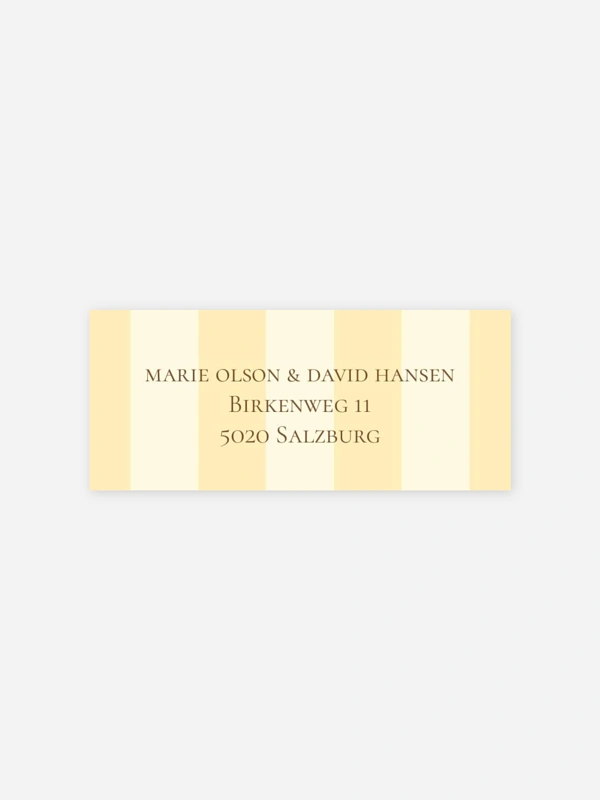 Gestalten Sie die selbstklebenden Absenderaufkleber "Sicily" mit Ihrer eigenen Adresse. So sind Ihre Umschläge nicht nur praktisch beschriftet, sondern auch optisch perfekt abgerundet zu Ihrer Hochzeitseinladung.