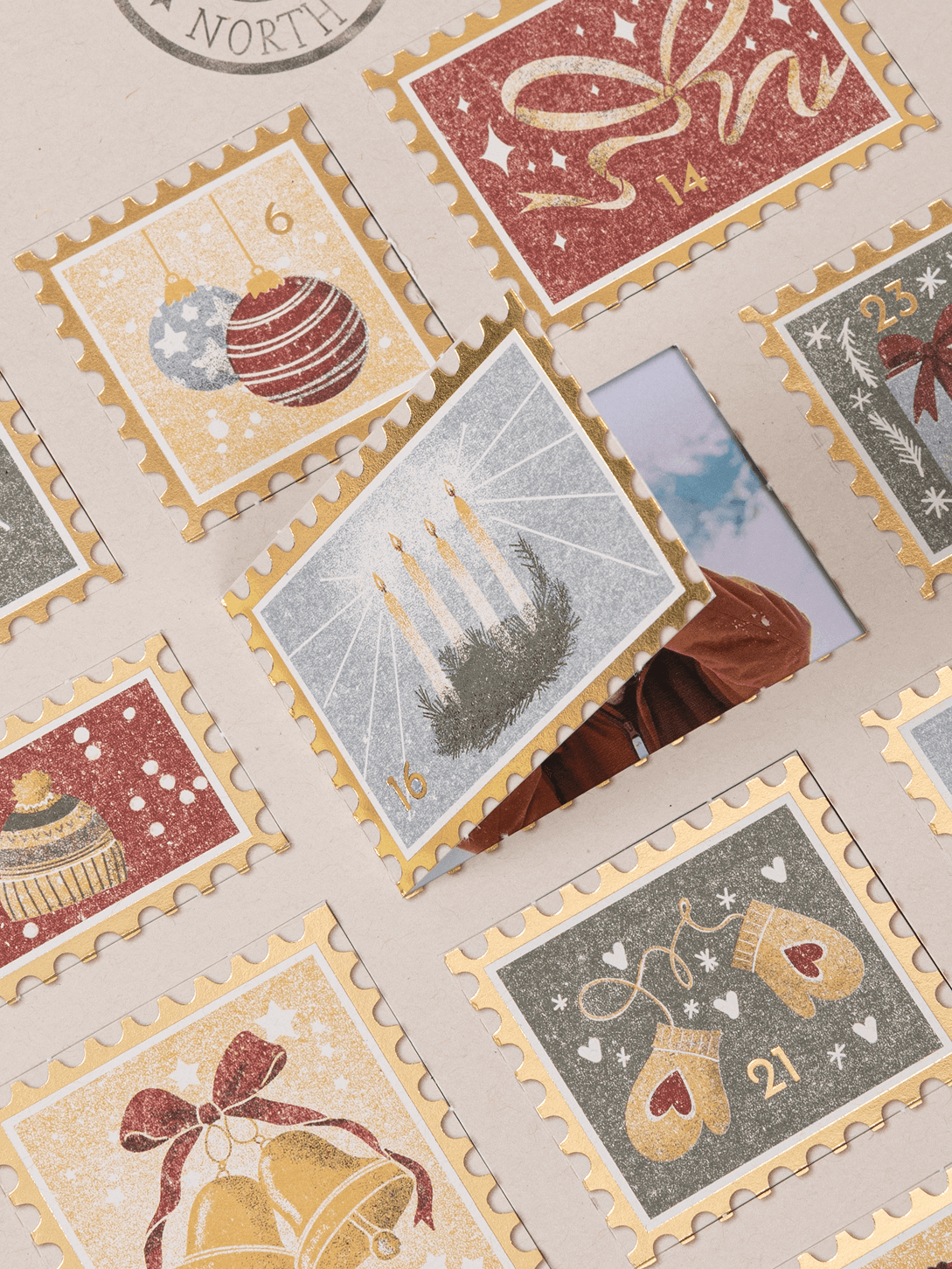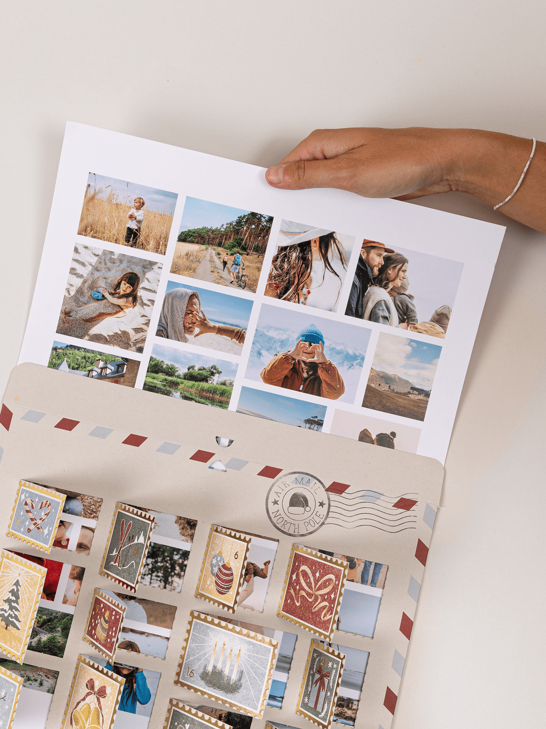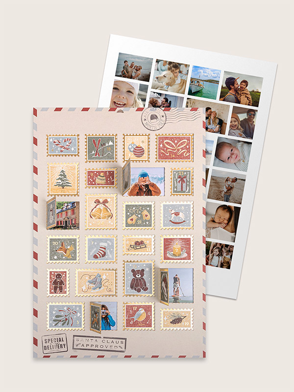 Mit unserem Adventskalender "Post von Santa" flattert jeden Tag ein lieber Gruß ins Haus und verkürzt die Wartezeit auf Weihnachten. Hinter 24 Türchen im nostalgischen Briefmarken-Look verbergen sich deine liebsten Menschen und Momente des Jahres. Die charmanten, weihnachtlichen Illustrationen und edel schimmernden Gold-Akzente machen diesen persönlichen Adventskalender zu einem echten Schmuckstück. So kannst du jeden Tag eine kleine, liebevolle Erinnerung teilen und ein Lächeln verschenken.