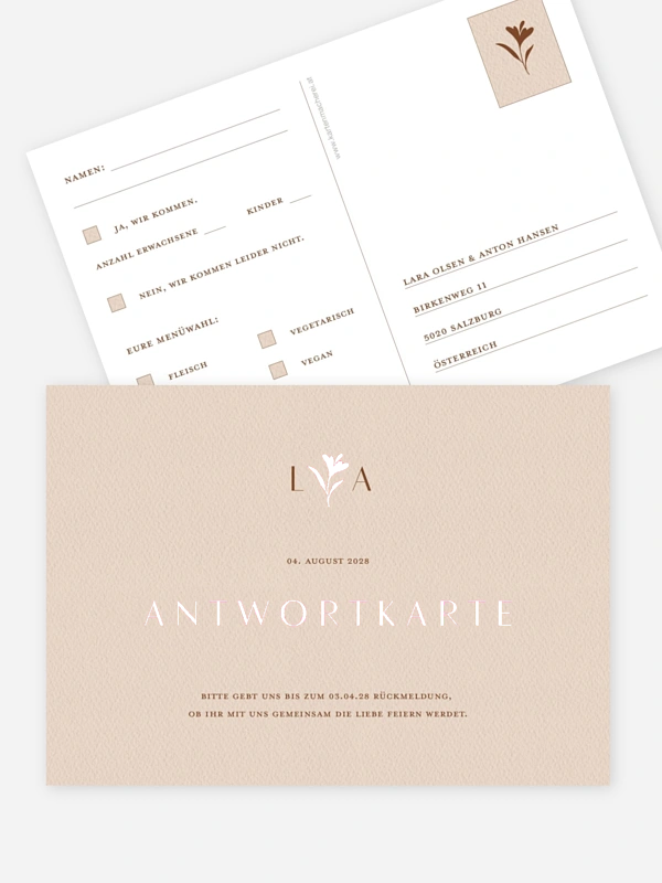 Die Antwortkarte "Monogram muse" wird gemeinsam mit der Hochzeitseinladung verschickt. Ihre Gäste können darauf ganz einfach mitteilen, ob sie an Ihrem großen Tag teilnehmen werden.