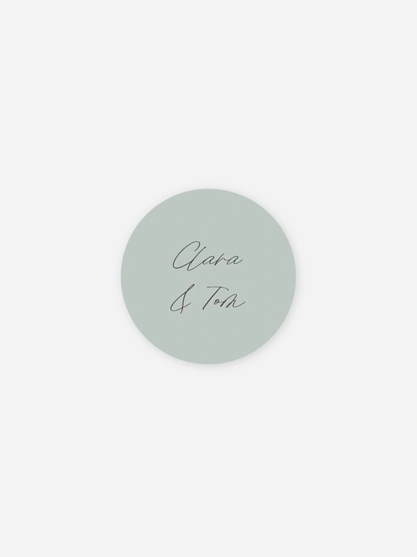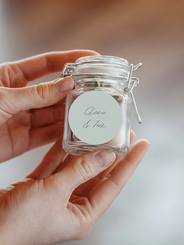 Personalisiere die Hochzeitssticker "Lavendelblatt" mit euren Namen und verschönere damit die Gastgeschenke für eure Lieben.
