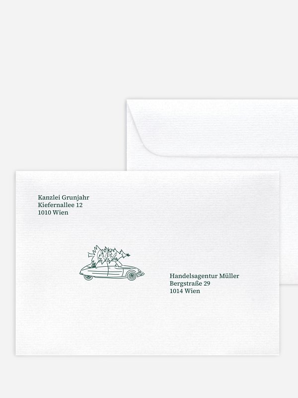 Perfekte Festtagspost beginnt beim Kuvert: Die bedruckten Briefumschläge "Vintage Car" sind die edelste Verpackung für Ihre Weihnachtskarten.