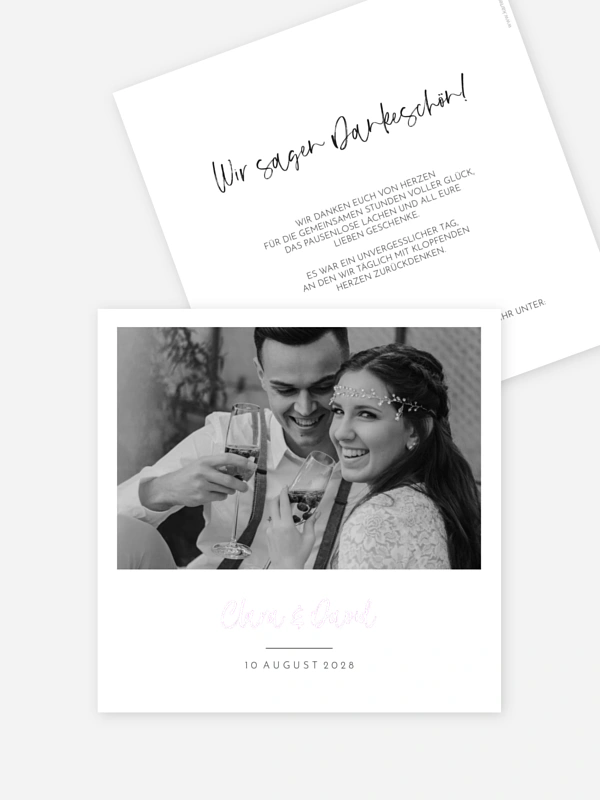 Mit der Dankeskarte "Dankbare Verbundenheit" lässt du eure Liebsten noch einmal tief in die schönsten Momente eurer Hochzeit eintauchen und sagst auf ganz persönliche Weise danke. Nutze die einfache Konfiguration im Gestaltungs-Tool, um eure Fotos auf hochwertigen Papieren strahlen zu lassen und eure Post liebevoll zu gestalten.