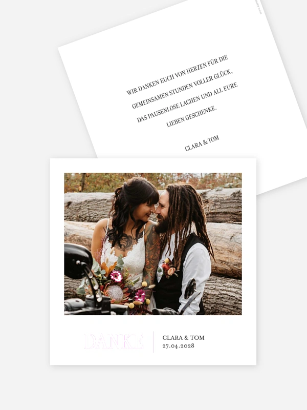 Sag euren Liebsten mit der Danksagungskarte "Feine Eleganz" auf ganz persönliche Weise Danke für die gemeinsame Zeit und all die schönen Glückwünsche zu eurer Hochzeit. Das zeitlose Design stellt euren liebsten Moment in den Mittelpunkt und lässt eure Gäste die Freude eures wundervollen Tages noch einmal spüren.