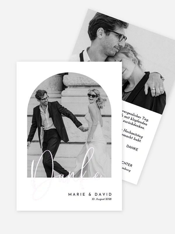 Eure Karte "Sanftes Dankeschön" lässt die Magie eures großen Tages noch einmal aufleben. Die stilvolle Fotocollage bietet viel Platz für eure liebsten Momente, damit ihr eure Dankbarkeit so echt und unbeschwert ausdrücken könnt, wie ihr euer gemeinsames Fest gefeiert habt.