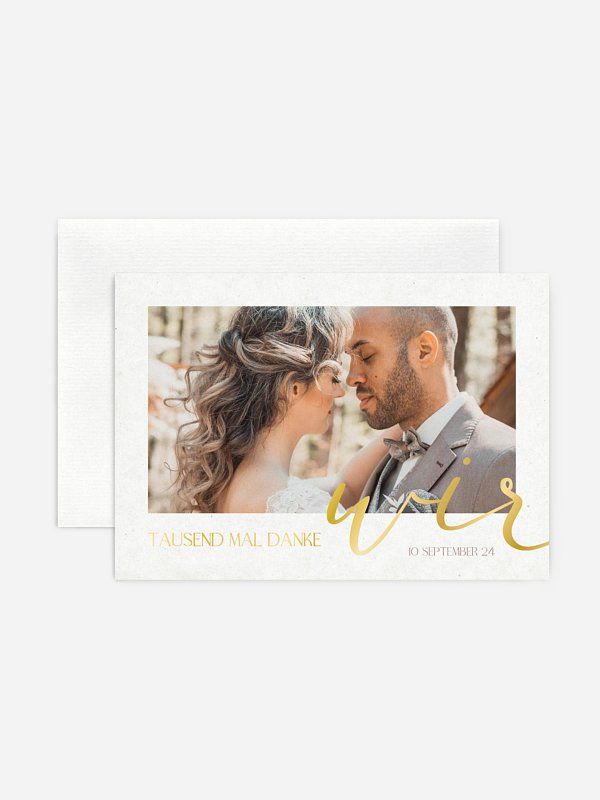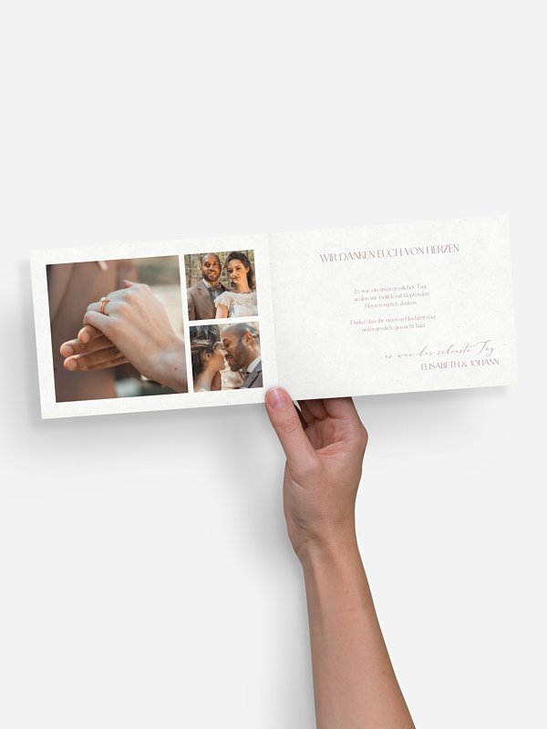 Ihr schönster Tag ist zwar vorbei, doch mit der Dankeskarte "Liebe" können Sie mit Ihren liebsten Fotos Ihre Traumhochzeit noch einmal Revue passieren lassen.