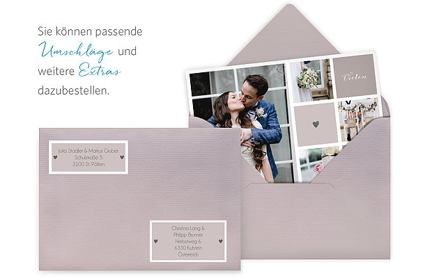 Die Dankeskarte "Mit Herz" bietet viel Platz für Ihre schönsten Fotos und erinnert alle Gäste und Gratulanten noch einmal an Ihren wunderschönen Tag.