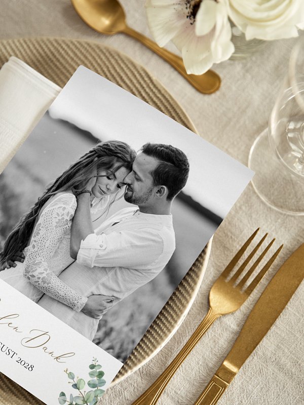 Schlichtes Grün passt zu allen Fotos: Die Dankeskarte "Natural Greenery" ist die schönste Art Ihre Hochzeit noch einmal Revue passieren zu lassen.