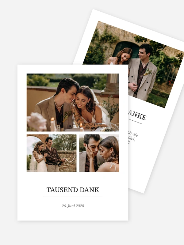 Die schönsten Augenblicke eures großen Tages verdienen einen Platz, an dem sie für immer strahlen können. Mit der Danksagung zur Hochzeit "Sanfte Erinnerung" teilt ihr eure liebsten Hochzeitsmomente mit euren Lieblingsmenschen und sagt auf herzliche Weise Danke für die gemeinsame Zeit. In unserem Gestaltungs-Tool lässt sich eure persönliche Dankeskarte ganz einfach konfigurieren, sodass ihr eure Botschaft mühelos und mit viel Gefühl übermitteln könnt. Wählt für eure Post eines unserer hochwertigen Papiere aus, um eure Erinnerungen so echt und schön wie den Tag selbst festzuhalten. Gestalte jetzt dein Set direkt online.