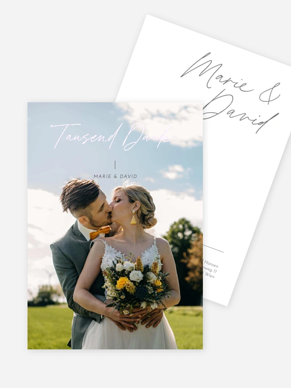 Eure Hochzeit war ein Tag voller Liebe und unvergesslicher Augenblicke, die ihr nun mit der Dankeskarte "Zeitlose Signatur" mit euren Liebsten teilen könnt. Das elegante Design stellt eure schönsten Fotos in den Mittelpunkt und gibt eurer gemeinsamen Geschichte einen besonders persönlichen Rahmen.