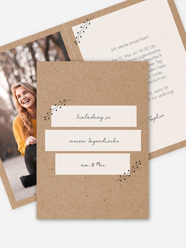 Zu dieser liebevoll gestalteten Einladung zur Jugendweihe wird niemand Nein sagen: auf der Karte "Blühend" wird der Name floral eingerahmt.