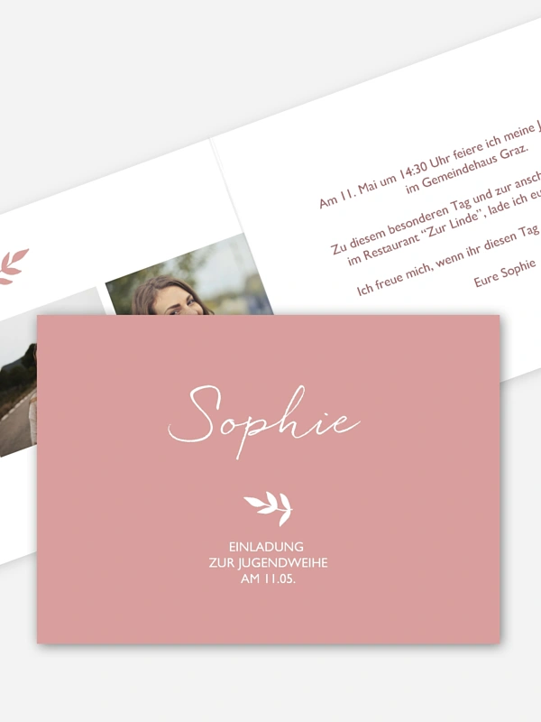 Ein kleines Zweiglein als dekoratives Zierelement schmückt die modern gestaltete Einladung zur Jugendweihe "Olivenzweig". Verleihen Sie der Einladung Leben mit Fotos und persönlichen Worten in einer von vielen verschiedenen Schriften.