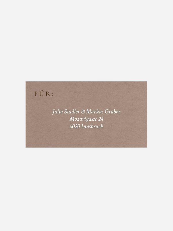 Personalisieren Sie die selbstklebenden Empfängeraufkleber "Mocca Moments" mit den Adressen Ihrer Gäste und bringen Sie sie direkt auf den Umschlägen an – schnell, ordentlich und stilvoll.