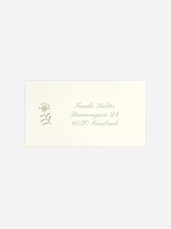 Die selbstklebenden Empfängeraufkleber "Wiesenflüstern" passen perfekt zur gleichnamigen Einladung und ersparen Ihnen das Beschriften der Kuverts per Hand.