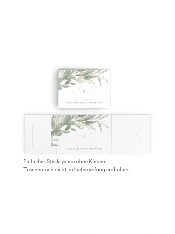 Sie planen eine Trauung im Freien oder lieben einfach natürliches Grün? Dann legen Sie Ihren Lieben für die Freudentränen Taschentücher mit der passenden Banderole im Design "Dear Greenery" aus.
