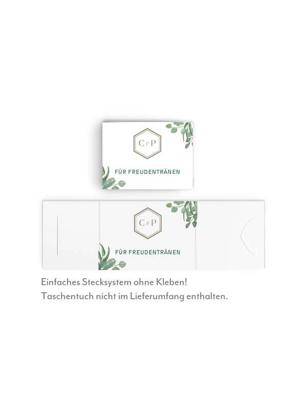Schaffen Sie einen stillvollen Rahmen für bewegende Glücksmomente mit den Banderolen "Eucalyptus" für Ihre Freudentränen-Taschentücher.