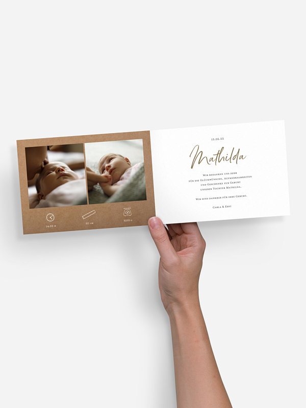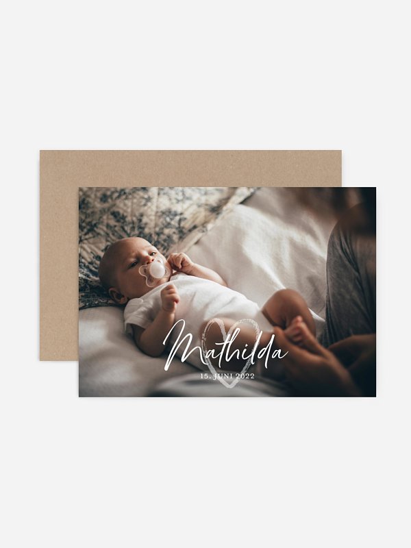 Hier stehen Ihre schönsten Babyfotos im Fokus. Dank des stilvoll schlichten Designs der Geburtskarte "Geborgenheit" und der puristischen Gestaltung lenkt nichts von Ihrem Neugeborenen ab.