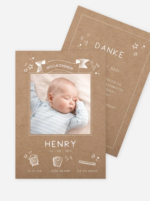 Handgezeichnete Illustrationen mit süßen Designelementen passen bei der Geburtskarte "Love of my Life" hervorragend zu den goldigsten Fotos Ihres Babys.