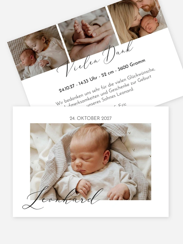 Teilen Sie ihr Glück mit Freunden und Verwandten! Die schlichte Geburtskarte "Nur Du" bietet Platz für große Fotos Ihres Babys.