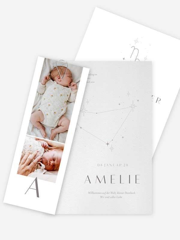 Mit der Geburtskarte "Sternbild Steinbock" kündigst du die Ankunft deines Babys auf eine ganz besondere Weise an. Das liebevolle Design mit passendem Sternzeichenmotiv verbindet Himmel und Herz und macht deine Botschaft zu einem kleinen Wunder zum Verschicken. Hochwertige Papiere und brillante Druckqualität sorgen dafür, dass deine Karte so schön bleibt wie der Moment selbst. Auf Wunsch erhältst du eine kostenlose Musterkarte, damit du dein Design in Ruhe anschauen kannst.