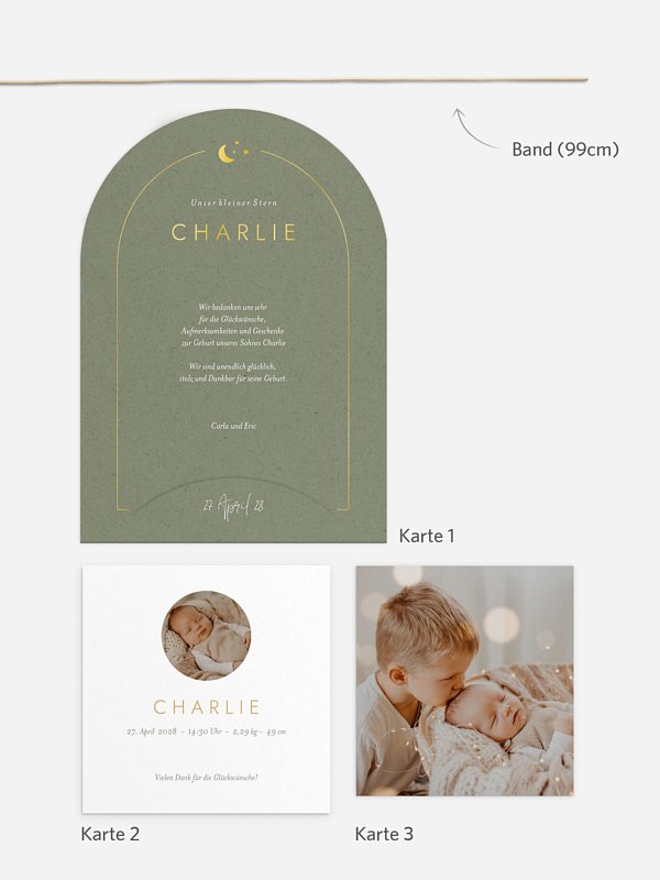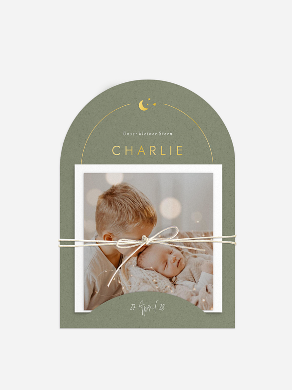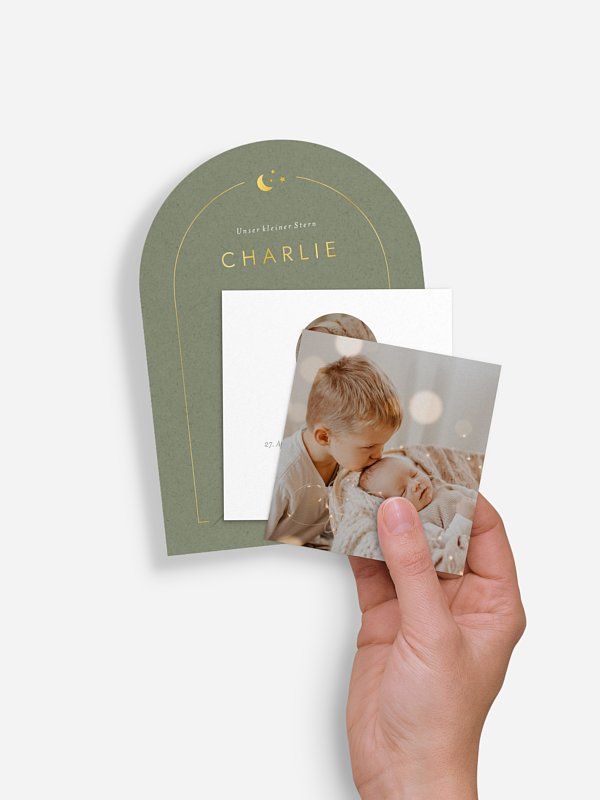 Teilen Sie ihr Glück mit Freunden und Verwandten! Die Geburtskarte "Sternenschimmer" bietet Platz für schöne Fotos Ihres Babys.