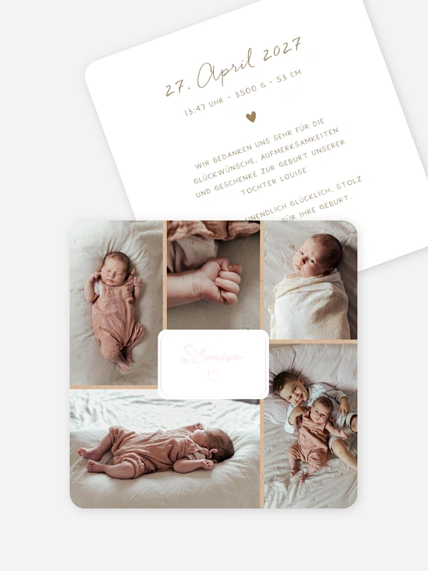 Zurückhaltend eingesetzte Designelemente rücken auf der Geburtskarte "Tiny Heart" die süßesten Fotos Ihres Babys auf stilvolle Weise in den Vordergrund.