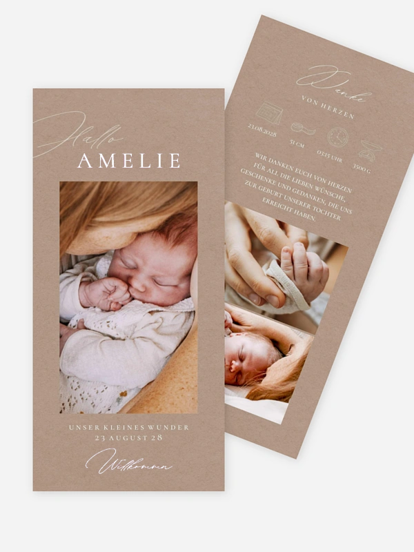 Die Geburtskarte "Unsere Welt“ sagt leise Danke – für all die Liebe, die euer Baby schon umgibt. Mit euren schönsten Fotos und einem liebevollen Design teilt ihr dieses Glück auf persönliche Weise mit Familie und Freund:innen. Hochwertiger Druck macht die Karte zu einem besonderen Andenken, das man gerne bewahrt.