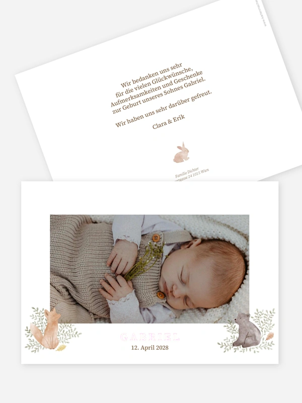 Mit der Geburtskarte "Waldwiege" verkündest du die Ankunft deines kleinen Wunders auf besonders herzliche Weise. Die liebevollen Illustrationen von Fuchs und Bär verleihen eurer Botschaft einen natürlichen Charme und lassen eure Liebsten an eurem ganz großen Glück teilhaben. In unserem Gestaltungs-Tool kannst du deine Geburtskarte ganz einfach konfigurieren und mit euren persönlichen Daten ergänzen. Hochwertige Papiere sorgen dafür, dass sich eure erste gemeinsame Erinnerung so schön anfühlt, wie sie aussieht. Gestalte jetzt dein Set direkt online.
