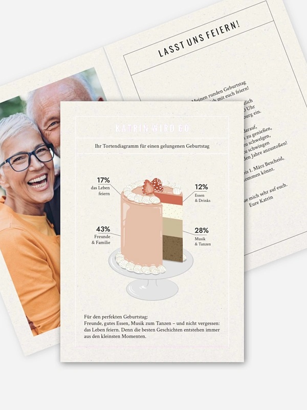 Die Einladung 60. Geburtstag "Birthday Chart" bringt auf den Punkt, was diesen Tag ausmacht. Sie zeigt, wie sich ein runder Geburtstag anfühlt: gemeinsam lachen, gut essen, tanzen und einfach zusammen sein. Deine Einladung zum Geburtstag wird so zu einer kleinen Vorschau auf das Fest selbst. Gestalten kannst du sie ganz unkompliziert im Gestaltungs-Tool – damit am Ende alles stimmig ist, vom ersten Eindruck bis zum großen Tag.