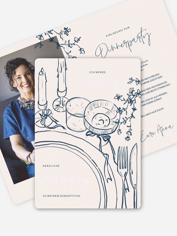 Mit der Geburtstagseinladung "Dinner Table" lädst du deine Lieblingsmenschen zu einem Abend ein, der nach Gesprächen, Lachen und gemeinsamem Anstoßen klingt. Die Illustration rund um den gedeckten Tisch schafft sofort Nähe und macht deine Einladung zum Geburtstag persönlich und herzlich. Du kannst deine Geburtstagseinladung ganz entspannt im Gestaltungs-Tool anpassen und Schritt für Schritt gestalten. Gedruckt auf hochwertigen Papieren und mit schneller Lieferung ist alles bereit für einen besonderen Moment, den ihr zusammen feiert.