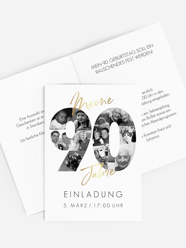 Ein echter Hingucker: Mit der fotoreichen Einladungskarte "Fotojahre" laden Sie Ihre Gäste auf persönliche Art und Weise zu Ihrem 90. Geburtstag ein.