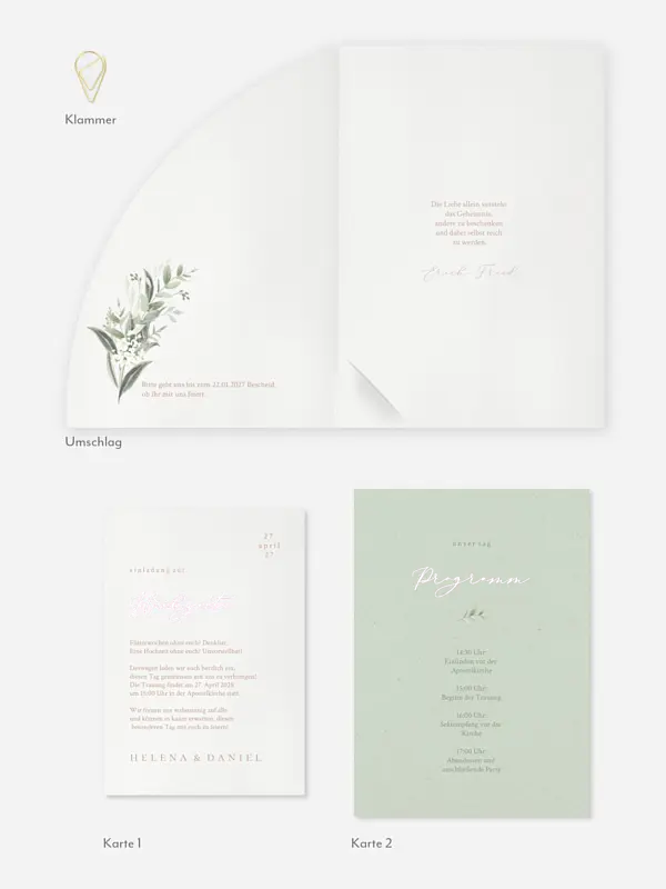 - Umschlag: 120 x 170 mm , Karte 1: 120 x 135 mm, Karte 2: 120 x 150 mm, Klammer: 25 mm