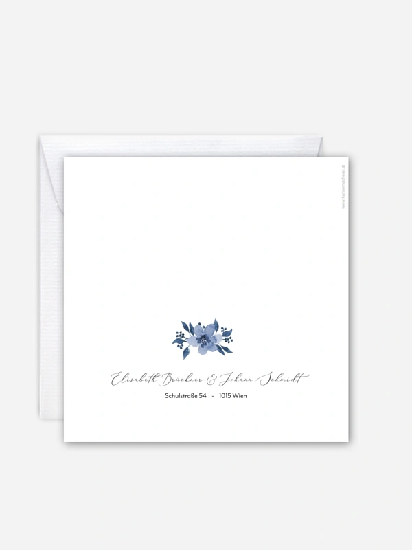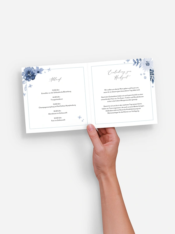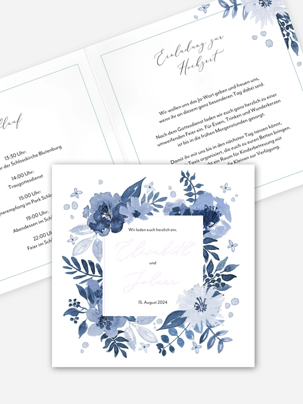 Die Hochzeitseinladung "Blue Garden" unterstreicht Ihr Blue Flower Thema der Hochzeit perfekt.
