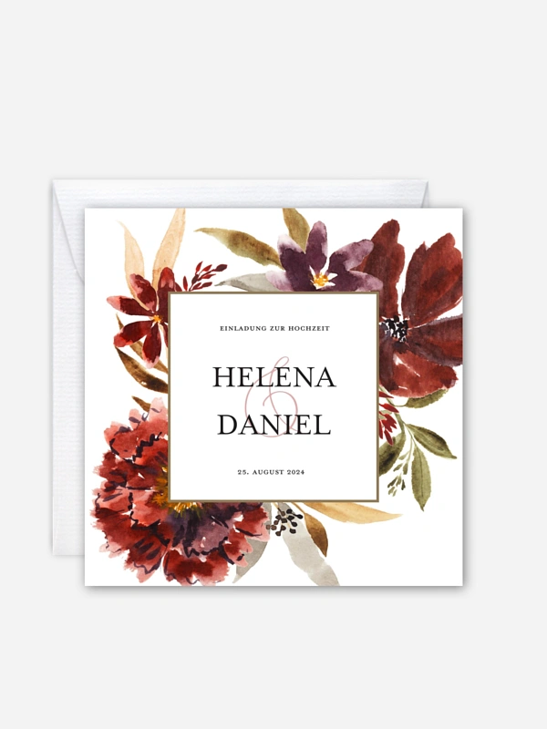 Die handgemalten Blumen und Blätter auf der Hochzeitseinladung "Dark Flowers" kommen auf dem dunklen Hintergrund besonders gut zur Geltung. Zusätzlich können Sie noch Ihre Lieblings-Veredelung wählen.