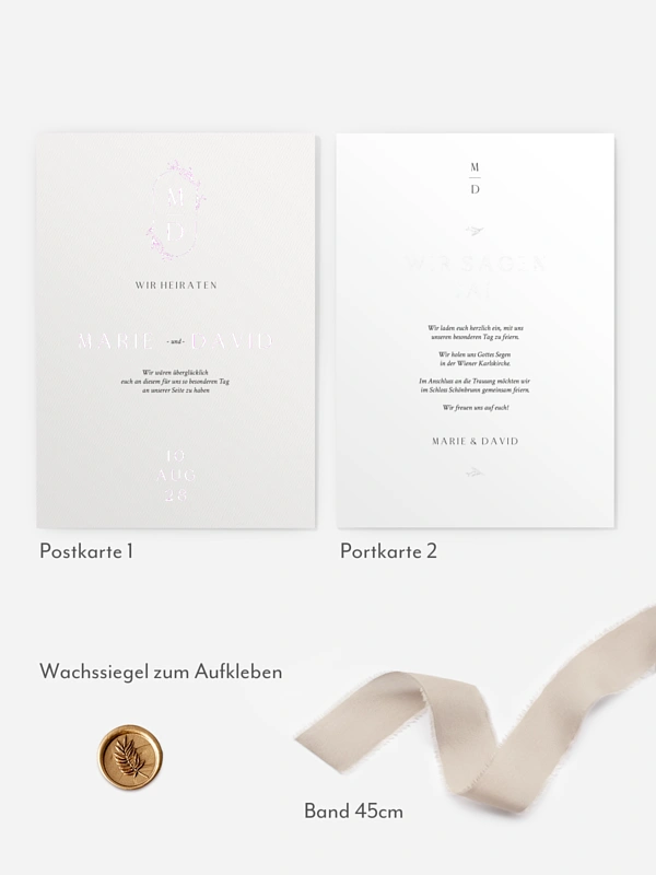 - Postkarten: 120x170 mm, Band: 45 cm, Wachssiegel: Ø 25mm