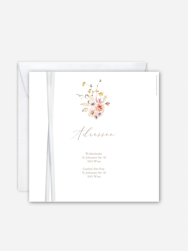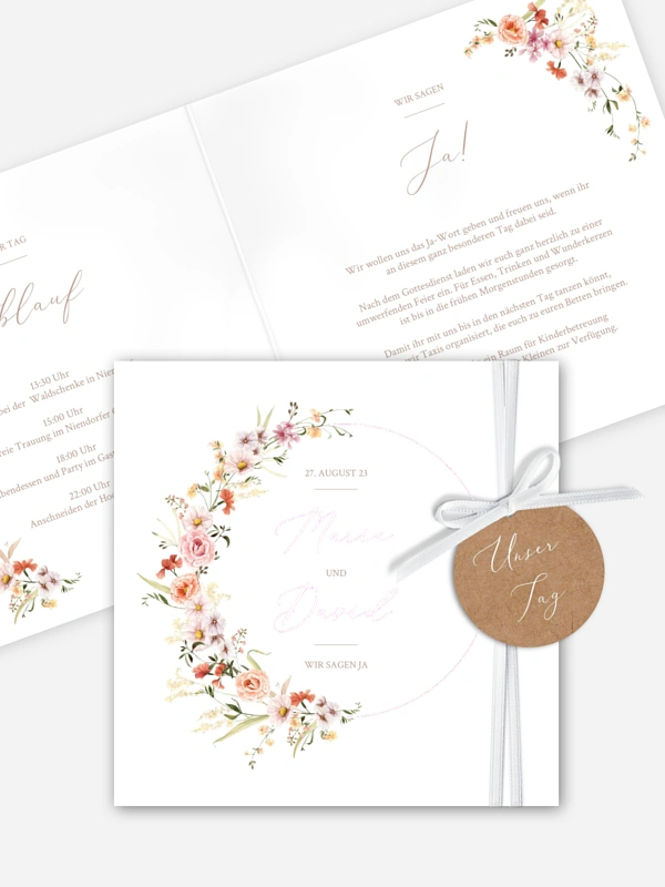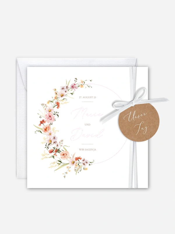 Zarte, wunderschöne Blüten umspielen Ihre Namen auf der Hochzeitseinladung "Flora".