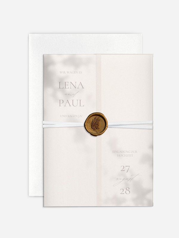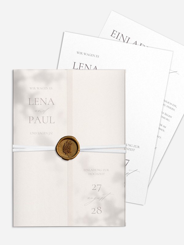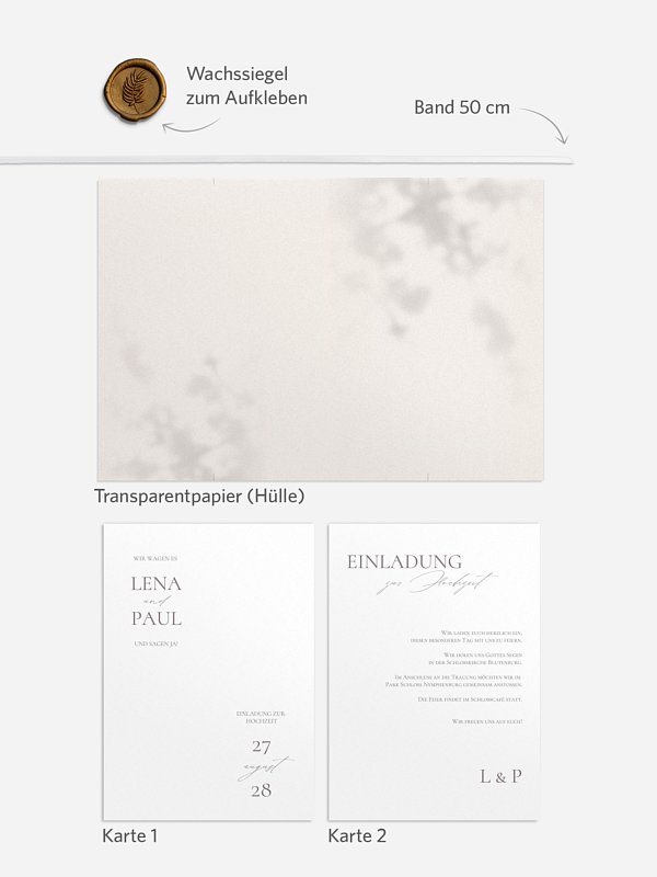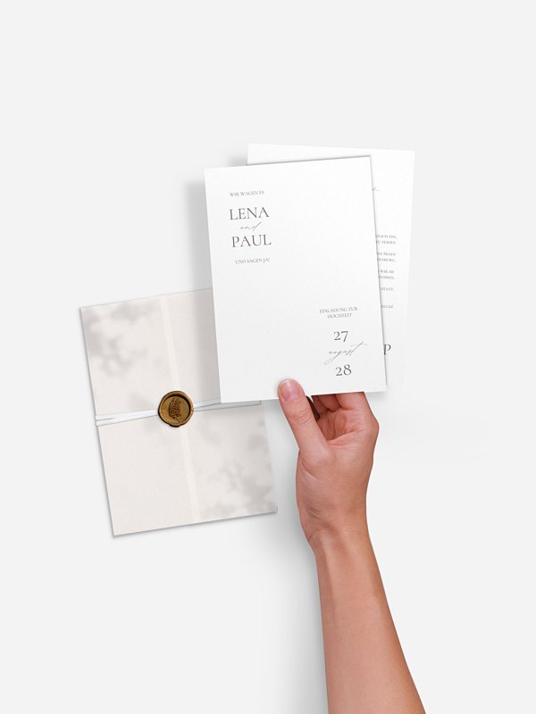 Die Einladung „Komorebi“ fängt den Zauber eines besonderen Moments ein – wie Sonnenstrahlen, die sanft durch die Blätter eines Baumes tanzen. Mit ihrem minimalistischen Design strahlt die eine natürliche Eleganz aus und ein Vorbote auf einen unvergesslichen Tag.