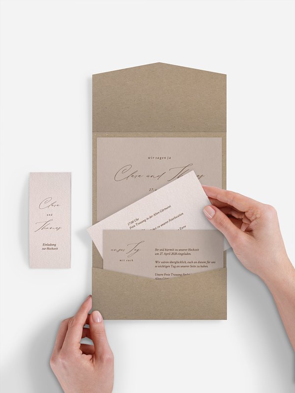 Die Hochzeitseinladung "Pure Lines" von Kartenmacherei beeindruckt durch ihr modernes Design und ihr ausgefallenes Format. Die klaren Linien und das minimalistische Layout verleihen der Karte eine elegante, zeitgemäße Ästhetik, die perfekt zu stilvollen Hochzeitsfeiern passt. Das außergewöhnliche Format setzt Ihre Einladung gekonnt in Szene und macht sie zu einem echten Hingucker. Mit Platz für individuelle Texte und Fotos können Sie diese Einladung ganz nach Ihren Vorstellungen gestalten. Hochwertig verarbeitet und auf edlem Papier gedruckt, ist die Hochzeitseinladung "Pure Lines" eine besondere Wahl, um Ihre Gäste stilvoll zu Ihrem großen Tag einzuladen.