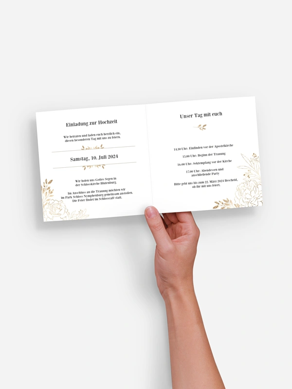 - Innenseiten: 1 Doppelseite für das Brautpaar, 2 unterschiedliche Doppelseiten für die Hochzeitsgäste, für Hochzeitspaare jeden Geschlechts geeignet.