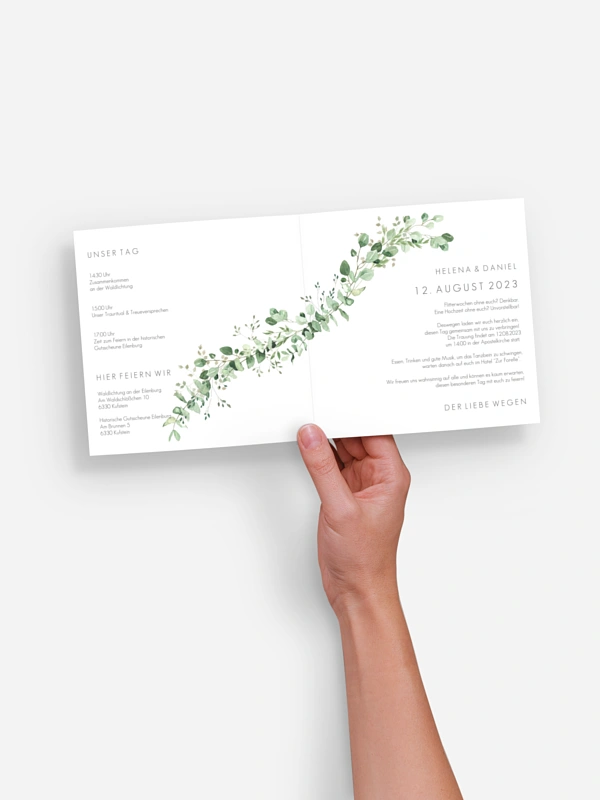 Die Hochzeitseinladung "Rustic Gold and Green" vereint alles was eine moderne Einladung braucht: Kraftpapierlook, veredelte Elemente und handgemalte Blätter.