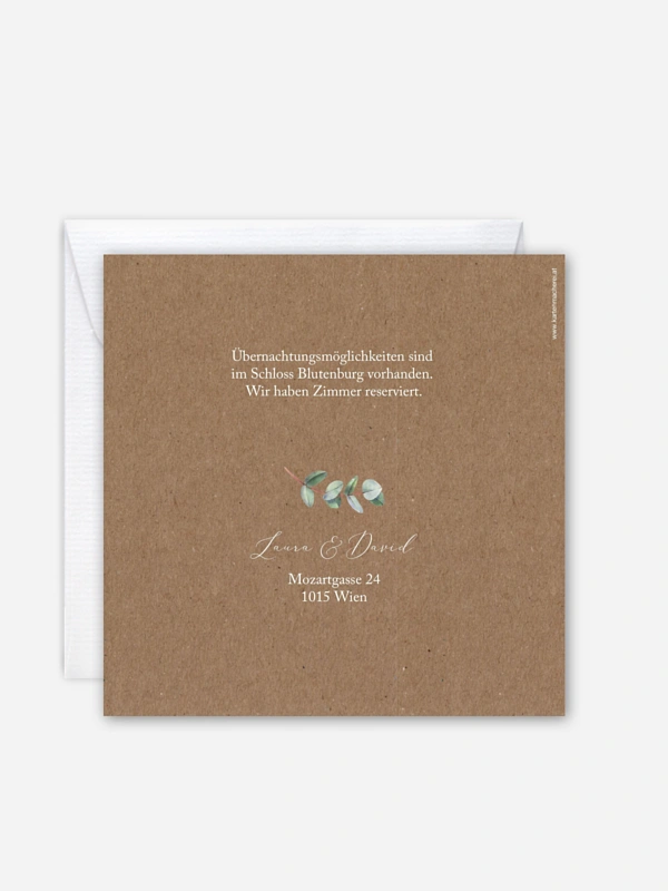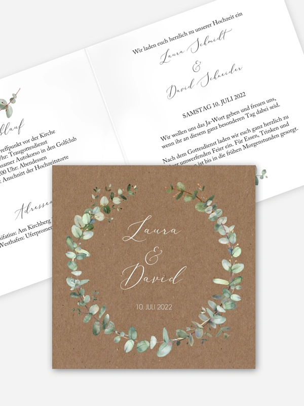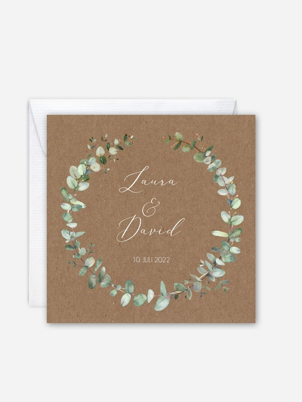 Klassischer Kranz gebunden aus handgemalten Eucalyptus-Elementen: unsere zarte Hochzeitseinladung "Green Minimal" auf Kraftpapier.