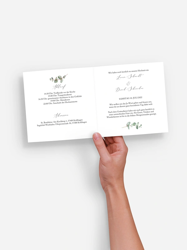 „Es war alles perfekt! Die Qualität der Karten und Umschläge ist erstklassig, das Druckbild hervorragend und der Service bestens.“ (Familie Hübner)