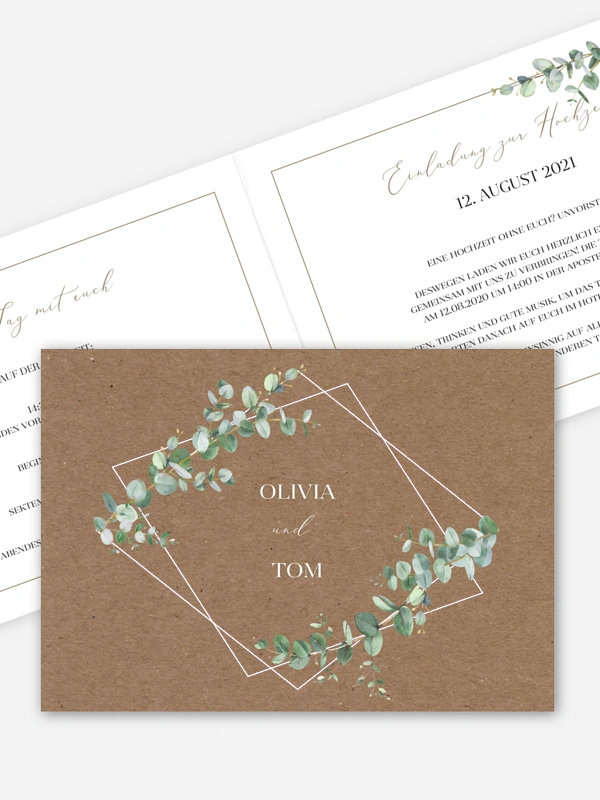 Die wunderschöne Hochzeitseinladung "Natural Greenery" ist nun auch mit rustikalem Kraftpapier-Hintergrund verfügbar. Wählen Sie außerdem Ihre liebste Veredelungsoption aus!