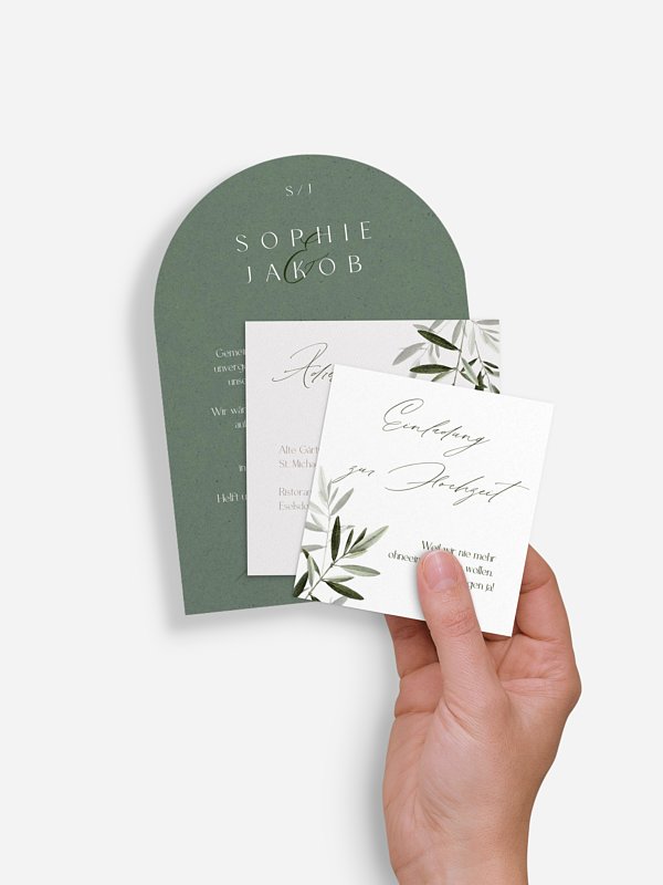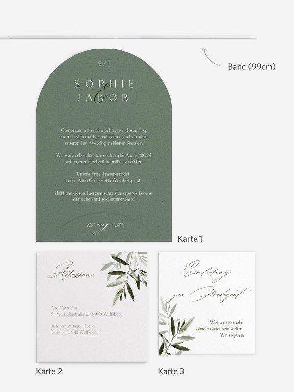 Zarte Olivenzweige versprühen ein warmes Urlaubsgefühl auf der Hochzeitseinladung "Tiny Leaves".