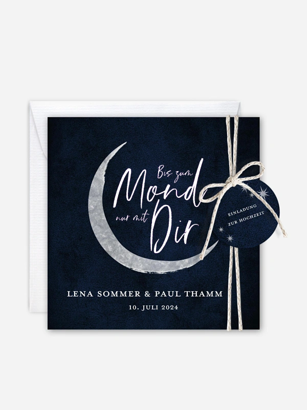 "I love you to the moon and back"! Mit dieser bedeutungsvollen Karte laden Sie ganz romantisch zu Ihrer Hochzeit ein.