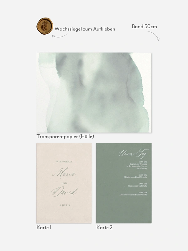 - Hülle: 120x171mm (geschlossen), Postkarten: 120x170mm, Band: 50cm, Wachssiegel: Ø 25mm