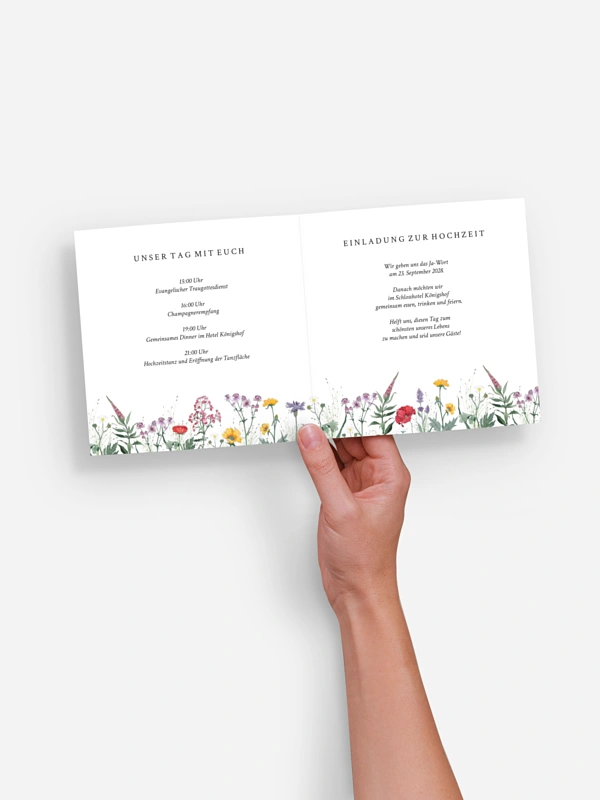 Die Hochzeitseinladung "Wildblumenkranz" verbindet natürliche Leichtigkeit mit einer klaren, zeitlosen Anmutung. Der fein illustrierte Blumenkranz setzt eure Namen dezent in Szene und macht diese Einladung zur Hochzeit persönlich, ohne sich in den Vordergrund zu drängen. Ideal für alle, die ihre Hochzeitseinladung bewusst schlicht und mit Gefühl gestalten möchten. Dank einfacher Konfiguration im Gestaltungs-Tool passt du Text und Details mühelos an und erhältst ein Ergebnis, das zu euch passt. Gedruckt auf hochwertigen Papieren entsteht so eine Einladung, die leise wirkt – und lange bleibt.