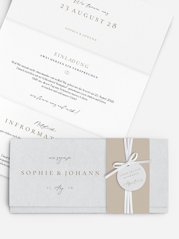 Die Hochzeitseinladung "Zärtliches Versprechen" erzählt von leisen Worten, großen Gefühlen und dem Wunsch, diesen Moment mit euren Lieblingsmenschen zu teilen. Mit ihrer ruhigen, liebevollen Anmutung wird diese Einladung zur Hochzeit zu einem echten Herzensgruß, der Nähe schafft, noch bevor ihr euch das Ja-Wort gebt. Beim Hochzeitseinladung gestalten begleitet dich unser Gestaltungs-Tool ganz unkompliziert – gedruckt auf hochwertigen Papieren und schnell bei dir. Gestalte eure Einladung jetzt so persönlich, wie eure Geschichte ist.