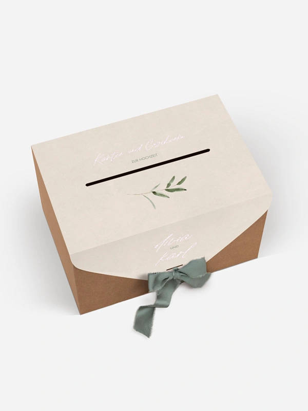 Die Kartenbox Hochzeit "Green Dream" ist die perfekte Begleiterin für euren großen Tag. In ihr finden all die lieben Glückwünsche und kleinen Überraschungen eurer Gäste einen sicheren Platz – schön gesammelt und mit einem Lächeln geöffnet. Das zarte Design fügt sich harmonisch in eure Hochzeitsdekoration ein und macht die Box zu einem besonderen Detail eurer Feier. Mit der gewohnt hochwertigen Verarbeitung von kartenmacherei wird sie zu einem Erinnerungsstück, das euch noch lange Freude bereitet.