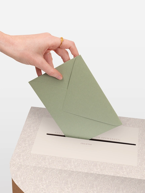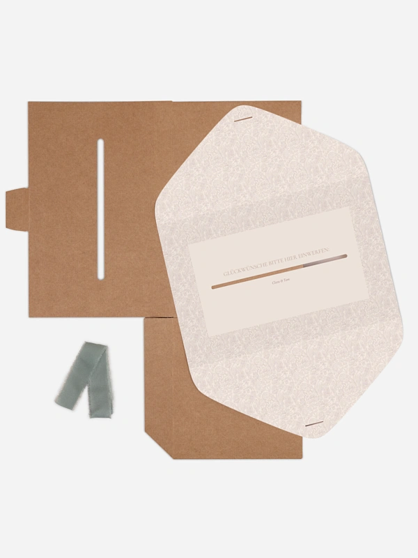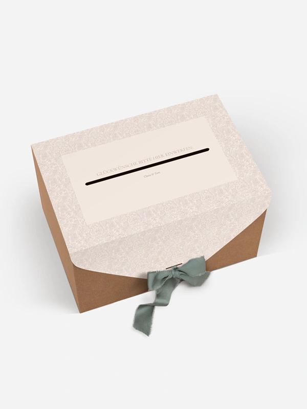 Unsere Kartenbox "Liebesgeschichte" ist die perfekte Kombination aus Funktionalität und Eleganz. Sie sammelt sicher Glückwunschkarten, Umschläge und kleine Aufmerksamkeiten Ihrer Gäste. Die Kartenbox wird flach geliefert und lässt sich einfach zusammenbauen. Sie enthält eine individuell gestaltbare Papierhülle sowie ein farblich passendes Band. Nach dem Aufbau fügt sie sich stimmig in Ihr Papeterie-Konzept ein und wird zu einem dekorativen Blickfang mit praktischem Nutzen.